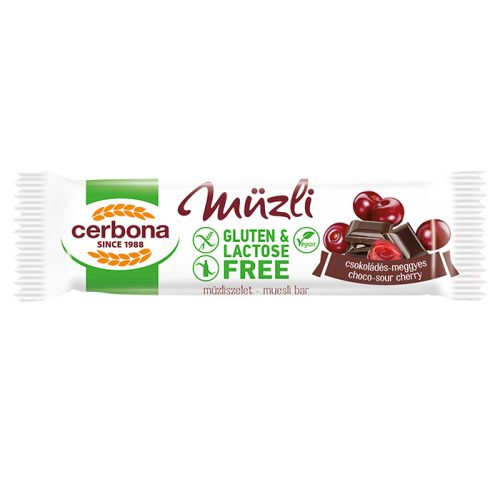 A Cerbona gluténmentes csokoládés-meggyes müzliszelet értékes tápanyag-összetételű, élelmirost-forrás, ezáltal jól beilleszthető az egészséges táplálkozásba, készítéséhez csak laktózmentes alapanyagokat használnak.